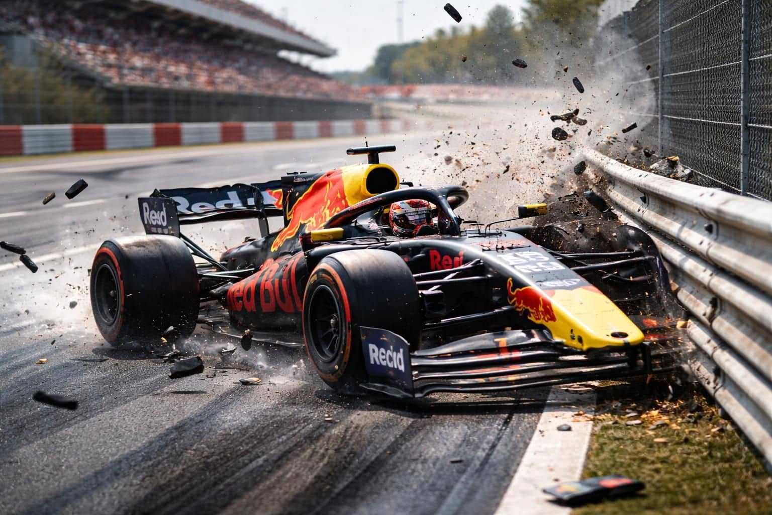 - Le crash a touché les barrières, provoquant des dégâts sur la voiture de course Red Bull Racing, mais le pilote est sorti indemne et les teams se préparent à remettre la monoplace en état pour poursuivre les essais.